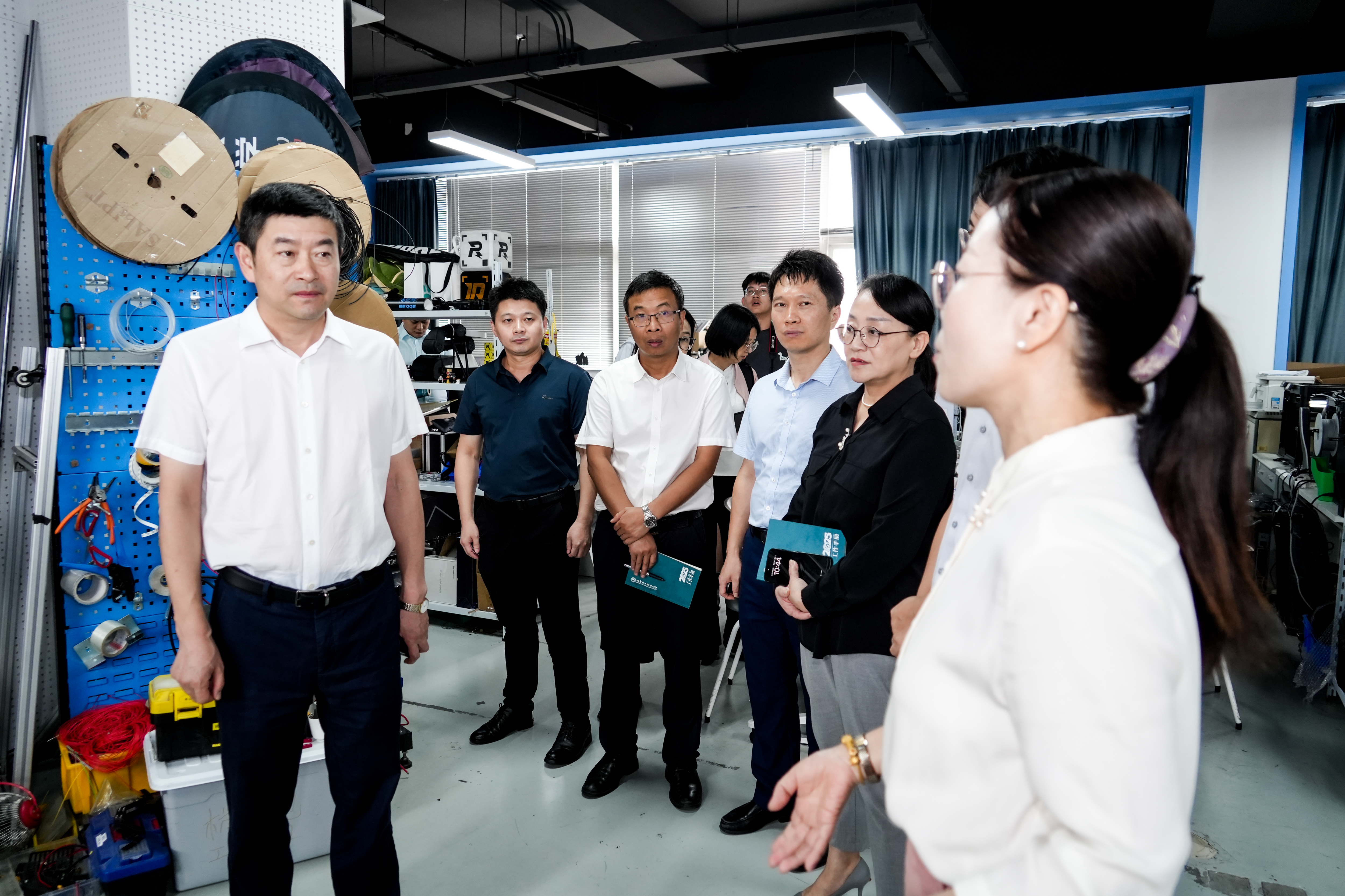 在自动化学院,王尧祥实地走访调研了杭电记忆书吧和学生科创中心,并与学院领导班子及教师代表进行了深入交流。他指出,自动化学院优势特色学科基础扎实,发展态势良好,要抢抓人工智能发展的历史性战略机遇,进一步提升学科专业建设水平,在推动学校高质量发展跃升中发挥更大作用;要加强顶层设计,树立高远目标,强化实绩贡献导向;要坚持教育、科技、人才一体化发展,以改革攻坚的思维求突破,进一步提升发展水平;要严守安全底线,以高水平安全保障高质量发展。